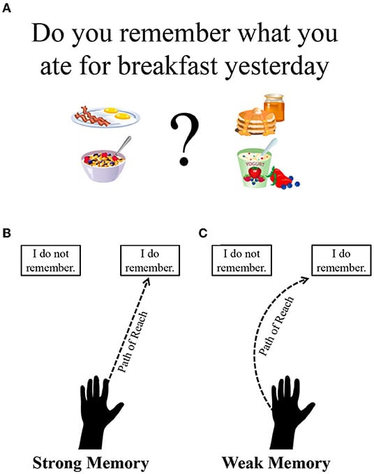 Hukommelse er en anden hjernefunktion, som spiller en vigtig rolle i næsten alt, hvad vi foretager os. Hukommelsen giver os mulighed for at huske og tænke på tidligere øjeblikke, lære af tidligere erfaringer, øge vores viden og forme vores personlighed. Hvor effektiv hjernen er til at danne minder, kan have stor indflydelse på vores hverdag. Forskere har brugt bevægelsessporing til at undersøge, hvor stærkt vores hukommelse dannes [4]. Ved hjælp af bevægelsessporing kan vi registrere den vej, hånden tager, når den bevæger sig mod enten en “jeg husker”-mulighed eller en “jeg husker ikke”-mulighed (figur 3A). Tænk for eksempel på, hvad du spiste til morgenmad i går morges. Kan du huske det? Hvis du gør, og du er meget selvsikker, så bør den vej, din hånd tager for at svare, at du husker, være lige og effektiv (figur 3B). Hvis du derimod ikke er sikker på, at du kan huske, hvad du spiste til morgenmad i går, men alligevel bevæger dig for at vælge “Jeg kan huske”, kan din bevægelse krumme i retning af “Jeg kan ikke huske” (figur 3C). Der opstår mere krumning, for selvom du kan huske, hvad du spiste til morgenmad i går morges, er hukommelsen ikke særlig stærk. Denne metode gør det muligt for forskere at studere bevægelser for at få indsigt i, hvordan hjernen danner minder.