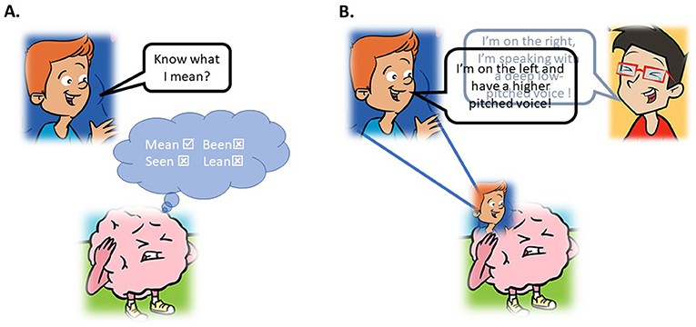 Hjernens opgave er at omdanne lyde til information om verden omkring os, som giver mening. Når du for eksempel hører en person tale og forstår de ord, de siger, regner du ikke bare ud, om lydene er høje, stille, tæt på, langt væk, stille eller i bevægelse. Din hjerne forsøger også at identificere lydene. Det gør den ved at trække på al den viden, den allerede har om disse lyde (figur 3A). Vi forstår ord, fordi vi allerede har lært sproget og ved, hvordan mange ord lyder; så du hører ikke bare lyde, men ord, der har betydning for dig. Så hvordan vi forstår lyde, er delvist afhængigt af, hvad vi allerede ved! Selv de ting, du ser, kan påvirke den måde, du opfatter lyd på. Det er ekstremt vigtigt, når du lytter til nogen, der taler – at se en persons ansigt gør dem lettere at forstå (se denne Frontiers for Young Minds-artikel for mere om, hvordan det, vi ser, påvirker vores hørelse).