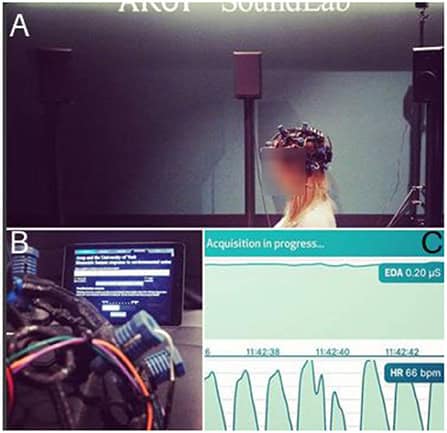 For at overvinde nogle af disse problemer designer vi laboratorietests. Vi optager lyde fra den virkelige verden og afspiller dem for folk ved hjælp af en teknik kaldet ambisonics, som er en specialiseret form for surround sound. Derefter måler vi, hvordan lytternes hjerner og kroppe reagerer ved hjælp af biosensorer, som er apparater, der registrerer ting som puls, svedproduktion, muskelspænding og hjerneaktivitet.