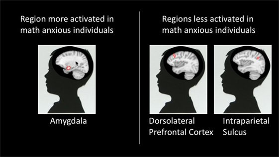 Hos børn med høj matematikangst er de områder i hjernen, der beskæftiger sig med arbejdshukommelse og matematisk bearbejdning (kaldet den dorsolaterale præfrontale cortex og den intraparietale sulcus) også mindre aktiverede (arbejder mindre hårdt) sammenlignet med disse hjerneområder hos børn, der har lav matematikangst [5].