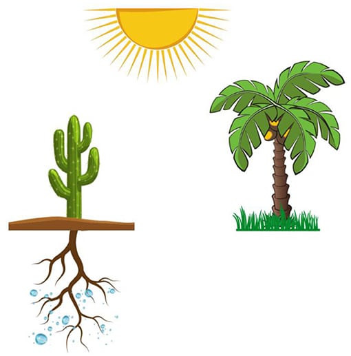 Mennesker er ikke de eneste væsener, der bruger mestringsstrategier. Tro det eller ej, men planter bruger også mestringsstrategier til at håndtere vanskelige plantesituationer! Planter kan opleve stress fra deres omgivelser, hvilket kan gøre det sværere for dem at vokse eller overleve [3]. Men hvilken slags stress har en plante brug for at klare? Varme er en af dem. Forestil dig en varm sommerdag. Når det bliver for varmt udenfor, kan du nemt søge skygge indenfor eller køle af med en lækker is. Planter er dog ikke så heldige. De kan ikke flygte fra varmen, fordi deres rødder er begravet i jorden (og de spiser ikke is). Forskellige typer af planter bruger specifikke strategier til at håndtere miljømæssige belastninger som ekstrem varme. For eksempel kan en kaktus klare ekstrem varme ved at dyrke superlange rødder, der går dybt ned i jorden, så den kan absorbere masser af vand for at holde sig afkølet. Palmer holder sig kølige i ekstrem varme ved at bruge deres store blade til at skabe skygge for deres stammer (figur 2). Både kaktusser og palmer kan overleve i ekstrem varme, men de håndterer denne vanskelige situation ved hjælp af forskellige strategier. Ligesom mennesker står planter over for alle mulige vanskelige omstændigheder, såsom for lidt vand, for meget vand eller meget koldt vejr. Planter må kigge i deres værktøjskasse og vælge de redskaber, der fungerer bedst til at hjælpe dem med at overleve under deres specifikke omstændigheder.