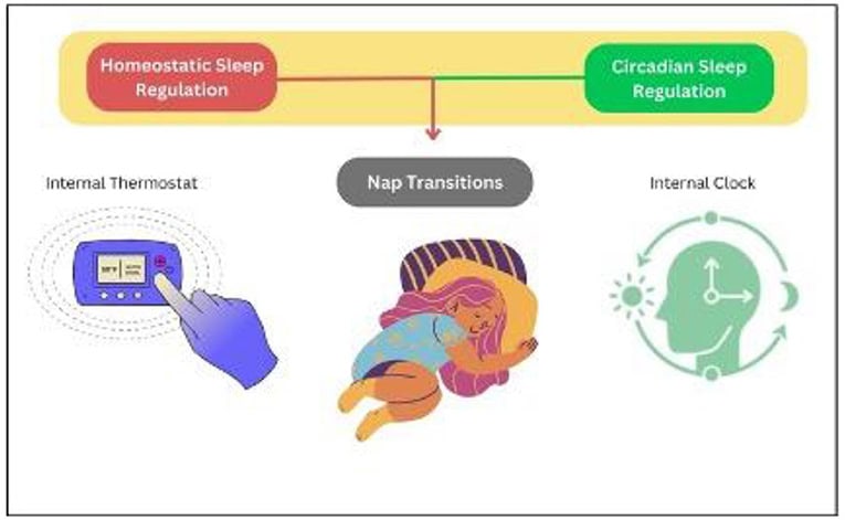 Vi har også et indre 24-timers ur, kaldet det cirkadiske ur, som holder vores søvn stabil. Disse regulatorer arbejder sammen om at bestemme, hvor meget søvn vi har brug for, baseret på tidspunktet på dagen, hvor meget energi vi har brugt den dag, og hvor meget søvn vi har fået natten før. Disse regulatorer arbejder også sammen, når børn holder op med at sove middagslur.