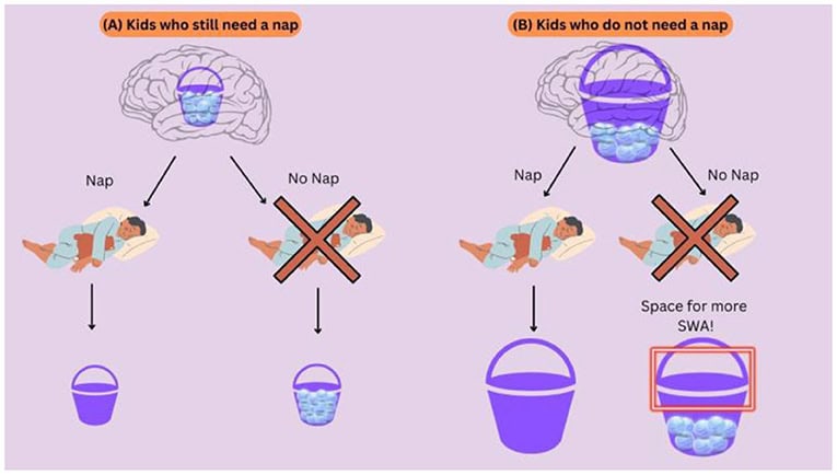 (A) Når børn er små, og deres spande er små, bliver de meget hurtigt fyldt, fordi børn skaber minder i løbet af dagen. Når de sover middagslur, tømmer de deres spande, så de kan fylde dem med flere minder, når de vågner. Hvis de ikke sover middagslur, forbliver spanden fuld, og det bliver svært at skabe nye minder. (B) Børn, der ikke længere sover middagslur, har mere modne hippocampus eller større spande. Lure hjælper dem stadig med at tømme deres spande, men fordi deres spande indeholder flere minder, kan de springe luren over og stadig have plads til flere minder.