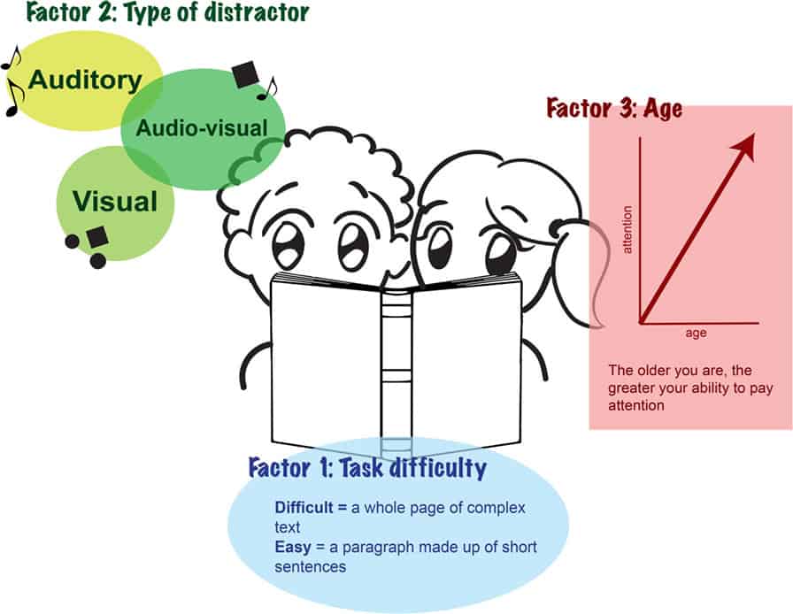 Forestil dig, at du er 7 år gammel og skal læse fire sætninger fra en bog for at lave dine lektier. De to første sætninger står på en side fuld af tekst, mens de to andre sætninger står for sig selv på næste side uden anden tekst omkring dem. Hvilke sætninger tror du, at du ville læse hurtigere og med mindre anstrengelse? Ville din storesøster, som er 11 år, læse disse sætninger hurtigere end dig? Hvad med din far? Forestil dig nu, at du laver dine lektier i en anden situation. Først laver du dine lektier på bordet, hvor du har andre notesbøger med ord skrevet på dem med stor skrift. Ville du blive distraheret af at kigge på bøgerne? Så sætter din mor et børneprogram på i radioen, og de synger alfabetet – du kan høre højttalerne sige “a”, “b”, “c” og andre bogstaver. Bliver du mere distraheret af dette, end du blev af notesbøgerne? Hvilke sætninger læser du nu langsommere – dem, der står alene på siden, eller dem, der er omgivet af anden tekst? Tror du, at din søster eller din far ville have problemer som dig, eller måske mere eller mindre? Endelig slukker din mor for radioen for at sætte et børneprogram på, hvor du både kan høre og se “a”, “b” og “c”. Hvem i din familie er mest distraheret nu? Og hvilken tekst læses nu langsomst? (at fokusere på én ting) er vigtigt for enhver hverdagsopgave – at læse, skrive eller spille videospil (for mere detaljerede definitioner af de nye begreber, se ordlisten). Ikke desto mindre bliver vi alle distraheret fra tid til anden. Hvad er årsagen til distraktion? Forskning i opmærksomhed tyder på, at distraktion er stærkt påvirket af den opgave, vi forsøger at udføre, af det, der distraherer os (hvilke af vores sanser, der er ophidsede), og af hvor gamle vi er. Alle tre faktorer er vigtige, men hver for sig kan de ikke forklare, hvordan selektiv opmærksomhed fungerer uden for laboratoriet, i det virkelige liv, hvor distraktioner normalt involverer mange sanser på én gang (kaldet multisensorisk). I denne artikel diskuterer vi først de tre faktorer, der påvirker, hvor distraherede vi bliver (figur 1). Derefter beskriver vi vores undersøgelse, hvor vi har koblet disse faktorer sammen for at forstå, hvordan distraktion fungerer i hverdagssituationer.