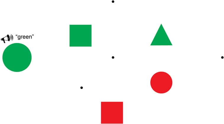 Vi testede 30 små børn (6-årige), 33 større børn (11-årige) og 30 voksne (20-årige). Disse deltagere skulle trykke på en knap på tastaturet, når de fandt enten en rød firkant eller en grøn cirkel på computerskærmen (figur 2 viser præcis, hvad deltagerne så). For hver af disse to målformer fik deltagerne også vist tre typer af distraktorer i den anden ende af skærmen: en rød firkant eller en grøn cirkelform (visuelle distraktorer), en stemmeoptagelse af ordene “rød” eller “grøn” (auditive distraktorer) eller formen og stemmeoptagelsen sammen (multisensoriske distraktorer). Distraktoren kunne matche målet (en rød firkantet distraktor til et rødt firkantet mål) eller ikke matche målet (en rød firkantet distraktor til et grønt cirkelmål). Dette blev gentaget 10 gange: 5 af gangene så deltagerne altid kun én figur, som var den, de skulle finde (let opgave); de andre 5 gange så de yderligere tre figurer sammen med den, de skulle finde (svær opgave).