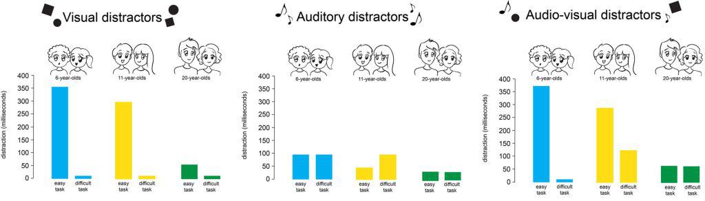 Distraktioner, der involverer flere sanser på samme tid, inklusive den, der er vigtig for opgaven, distraherer os, uanset hvor gamle vi er, når opgaven er let. Når opgaven er svær, påvirker vores alder vores distraktion. Når vi er små børn, påvirker multisensoriske distraktioner os kun lidt. Men når vi bliver ældre, begynder multisensoriske distraktioner at påvirke os mere, som de påvirker voksne. Når vi er voksne, kan multisensoriske distraktioner distrahere os, selv når den opgave, vi udfører, er vanskelig.