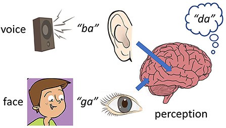 Vi ved, at vores hjerner ofte bruger både syn og hørelse til at forstå verden. Det kan gøre det lettere for vores hjerne at afgøre, hvad der foregår, end hvis vi kun brugte én sans. Men på samme måde som en visuel illusion kan spille hjernen et puds via øjnene, kan en audiovisuel illusion forvirre opfattelsen, hvis informationerne fra hørelsen og synet ikke stemmer overens. Dette blev illustreret af et eksperiment udført af Harry McGurk og John McDonald i 1976 [1]. Disse forskere optog en person, der sagde lyden “ba”. Derefter lavede de en stum video af den samme person, der sagde lyden “ga”. De afspillede lydoptagelsen (“ba”) sammen med videoen (“ga”) og bad frivillige om at sige, hvilken lyd de hørte. Du bliver måske overrasket over at høre, at de fleste frivillige sagde, at de hørte lyden “da”! Det skyldes, at deres hjerner blandede det, de så og hørte, sammen og gættede på, hvad lyden egentlig var. Det fantastiske ved dette eksperiment er, at det virkelig ændrer den måde, ordene lyder på, hvilket kaldes McGurk-effekten. (figur 2). Eksperimentet viste, at det at se et talende ansigt kan have en stærk effekt på de lyde, folk opfatter1. Effekten findes også med andre kombinationer af lyde. Opfattelsen af tale er i virkeligheden resultatet af, at hjernen gør sit bedste gæt ud fra det, vi ser, det, vi hører, og det, vi allerede ved om sprog.