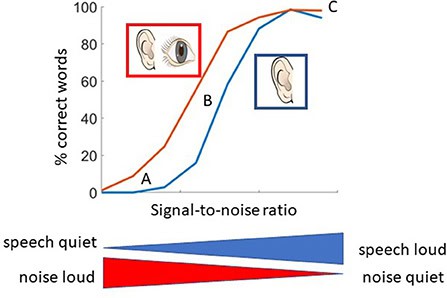 Vi udførte nogle eksperimenter om, hvordan baggrundsstøj påvirker forståelsen af en sætning [2]. Først filmede og optog vi en frivillig, der sagde flere forskellige sætninger (såsom “En stor størrelse i sko er svær at sælge.”). Derefter afspillede vi disse optagelser for andre frivillige og bad dem gentage, hvad de hørte, og vi talte, hvor mange ord de fik rigtigt. Vi gentog dette eksperiment med mange frivillige, tilføjede forskellige niveauer af baggrundsstøj eller reducerede lydstyrken af talesignalet. Forholdet mellem talesignalet og baggrundsstøjen kaldes signal-to-noise ratio. Nogle gange afspillede vi kun lyden af den person, der talte, og andre gange viste vi også videoen af personen, så de frivillige både kunne se og høre den talende person.