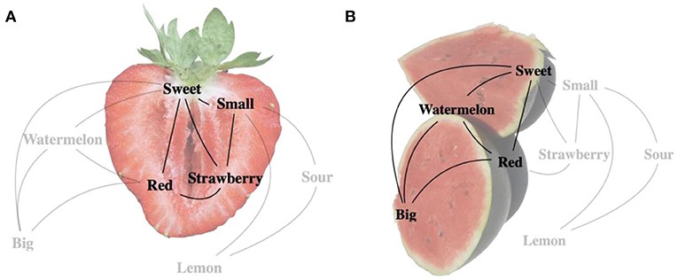 Lad os for eksempel forestille os en gruppe af begreber: sur, sød, lille, stor, rød, citron, jordbær og vandmelon (figur 1). Associationisme betyder, at når man tænker på et jordbær, så aktiveres de associerede, jordbærrelaterede begreber, såsom rød, lille og sød (men ikke citron, stor eller vandmelon). Styrken af forbindelserne mellem de associerede begreber opbygges af vores interaktion med verden omkring os. Jo mere vi oplever en sød smag sammen med synet af en frugt, der tilfældigvis er rød, jo stærkere bliver forbindelsen mellem de tre begreber.