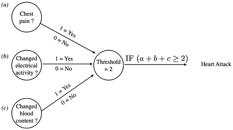 Så eftersom en nervecelle reagerer på en alt-eller-intet-måde og kun kan være i én af to tilstande (0-ikke aktiv eller 1-aktiv), kunne et netværk af nerveceller så repræsentere processen med at diagnosticere et hjerteanfald? Figur 3 viser et sådant netværk. Dette netværk har to lag. Det første lag, kaldet inputlaget, består af tre celler, hvis aktivitet repræsenterer de tre tegn på et hjerteanfald: celle [a] repræsenterer brystsmerter, celle [b] repræsenterer ændringer i hjertets elektriske aktivitet, og celle [c] repræsenterer ændringer i proteinkoncentrationen i blodet. Det andet lag (outputlaget) indeholder kun én neuron, som modtager det summerede input fra de tre celler i det første lag. Aktiviteten af denne ene neuron i det andet lag afgør, om betingelserne for at diagnosticere et hjerteanfald er blevet opfyldt (figur 3).