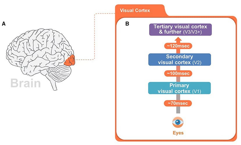 Med andre ord bevæger visuel information sig fra øjnene gennem niveauerne i den visuelle cortex på meget kort tid (figur 1). Det forklarer, hvordan du hurtigt kan genkende en ven til en koncert. Når du læser denne artikel, kan du også forstå betydningen af hvert ord i en sætning i stedet for bare at se et virvar af ord. Din hjerne og dine øjne arbejder sammen som et team om at bearbejde visuel information.
