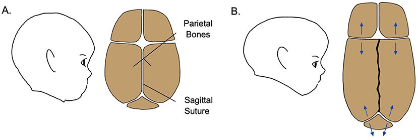 Sagittal kraniosynostose er den mest almindelige form for kraniosynostose. Den opstår, når sagittal sutur som løber lodret ind mellem kraniets parietalknogler, smelter sammen for tidligt i udviklingen. Hvis den sagittale sutur smelter sammen, kan det forhindre kraniet i at vokse i den rigtige retning. Når hjernen vokser, får det de andre suturer i kraniet til at bevæge sig længere væk fra hinanden end normalt, hvilket tvinger barnets hoved til at blive langt og smalt i stedet for bredt og rundt (figur 1). Sagittal kraniosynostose forekommer hos ca. 1 ud af 5.000 fødsler og er mere almindelig hos drenge end hos piger [1, 2].