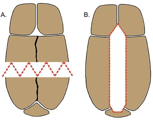 Der findes to typer operationer til at reparere sagittal kraniosynostose: Total rekonstruktion af kraniehvælvingen (større operation) og endoskopisk suturektomi (mindre operation). Den større operation har været brugt i mange år til at behandle kraniosynostose. Under operationen laver lægerne et zigzag-snit i huden for at afdække kranieknoglerne (figur 2A). Når de er afdækket, fjernes dele af kraniet og omplaceres for at skabe en mere normal hovedform. Det giver hjernen plads nok til at vokse ordentligt. Desværre kan den større operation medføre et stort blodtab, hvilket kan komplicere helingsprocessen og forlænge hospitalsopholdet [3].