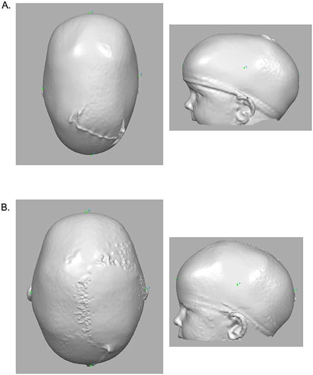 For at sammenligne resultaterne af operationerne blev der taget 3D-billeder af hvert barns hoved før og efter operationen ved hjælp af en maskine, der hedder 3dMD (figur 3). Under 3D-fotograferingen bar hvert barn en kasket for at sikre, at deres hår ikke påvirkede billedets kvalitet, hvilket gav et bedre billede af deres hovedform. Hvert 3D-billede blev uploadet til et redigeringsprogram på hospitalets computere for at beregne cranial index En standardmåling, der repræsenterer et spædbarns hovedform. For at beregne kranieindekset brugte forskerne en linealfunktion i programmet til at måle længden og bredden af barnets hoved. Kirurgerne fandt ud af, at begge typer operationer kunne rette op på hovedformen hos hvert barn, men den større operation var lidt bedre til at give hovederne en mere “normal” form.