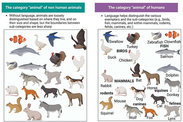 For at overleve må dyr lære at kategorisere, hvilket betyder at gruppere ting sammen. For eksempel skal dyr have mentale kategorier for “bytte” og “rovdyr” for at nærme sig byttedyr og undgå rovdyr. I modsætning til andre dyr bruger mennesker ord til at betegne deres kategorier (figur 1). For eksempel bruger vi ordet “dyr” til at referere til fugle, fisk og pattedyr. At navngive en kategori får os til at føle, at kategoriens medlemmer ligner hinanden mere.