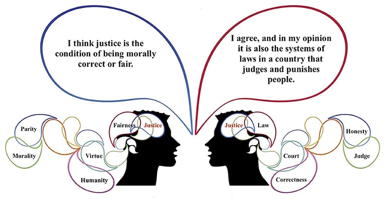 Læringsprocessen er meget sværere for abstrakte begreber. Tænk på det abstrakte begreb “retfærdighed”. Ting, der hører til begrebet “retfærdighed”, ligner ikke hinanden med hensyn til, hvordan de ser ud, de lyde, de producerer, den smag, de har, eller nogen anden kvalitet. Derudover kan medlemmerne af “retfærdighed” referere til forskellige mål eller situationer, for eksempel til en retssal, hvor en dommer skal afsige en dom, eller til en gruppe venner, der ønsker at dele noget slik ligeligt. For at finde ud af, hvilke ting der indgår i begrebet “retfærdighed”, har vi brug for, at andre forklarer os, hvad retfærdighed betyder. Folk kan have ret forskellige ideer om, hvad “retfærdighed” eller andre abstrakte begreber betyder, og det kan føre til diskussioner, hvor ideer sammenlignes eller endda debatteres. Nogle gange kan diskussioner om abstrakte begreber endda få os til at ændre mening om, hvad vi tror, de betyder (figur 3).