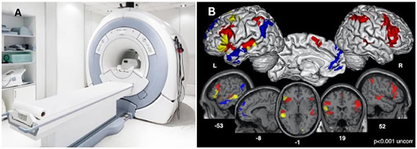 Forskere bruger forskellige teknologier til at se, hvordan vores hjerner ser ud, og hvordan de fungerer, mens de udfører specifikke opgaver. Almindeligt anvendte teknologier omfatter magnetisk resonansbilleddannelse (MRI), og funktionel magnetisk resonansbilleddannelse(fMRI). En MR-scanner giver forskere mulighed for at indsamle billeder af blødt væv i vores kroppe, som f.eks. vores hjerner (Figur 2A). MR-scanneren bruger kraftige magneter og radiobølger til at skabe detaljerede 3D-billeder, så forskerne kan indfange hjernens nøjagtige form og struktur. For eksempel kan forskere bruge MRI til at teste, om der er strukturelle forskelle i hjerneområder, når folk spiller musik eller laver kunst i mange år.