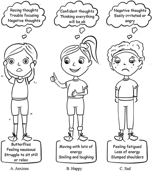 | Ængstelig | – Sommerfugle i maven – Kvalme – Prikkende fornemmelser – Svært ved at sidde stille eller slappe af | – Tankemylder – Problemer med at fokusere på én ting – Negative tanker | – Dårlig sportspræstation – Dårlig timing af sportsfærdigheder |