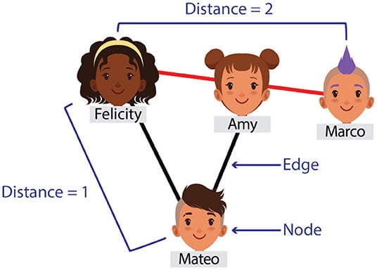 Vi kan også bruge oplysningerne i et socialt netværk til at beregne, hvor tæt folk i netværket er på hinanden. Dette er en abstrakt form for distance. Antag, at vi vælger to tilfældige elever, Felicity og Marco, i en skoles sociale netværk. Vi kan beregne afstanden mellem Felicity og Marco ved hjælp af oplysningerne om, hvem deres venner er. Hvis Felicity og Marco er venner med hinanden, er der en afstand på 1 mellem dem. Hvis de ikke er venner med hinanden, men Felicity er venner med Amy, som er venner med Marco, så er Marco og Felicity “venners venner”, og så er der en afstand på 2 mellem dem (se figur 1).