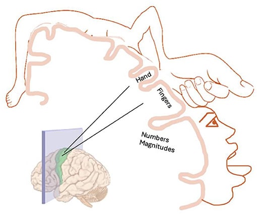 Hvad betyder kropsliggjort kognition for indlæring af nye ideer, f.eks. i skolen? Tænk på indlæring af abstrakte ideer, f.eks. i matematik. Matematik ses ofte som abstrakt, men kropsliggjort kognition indebærer, at kropslige erfaringer fra det virkelige liv hjælper os med at mestre ikke kun grundlæggende matematiske ideer (f.eks. tal), men også mere avancerede matematiske ideer. Hvad angår det grundlæggende, fortæller hjerneforskningen os, at når vi håndterer tal og laver simpel aritmetik, er der et overlap i de dele af hjernen, som også er aktive, når vi bevæger vores fingre (figur 2) [3].
