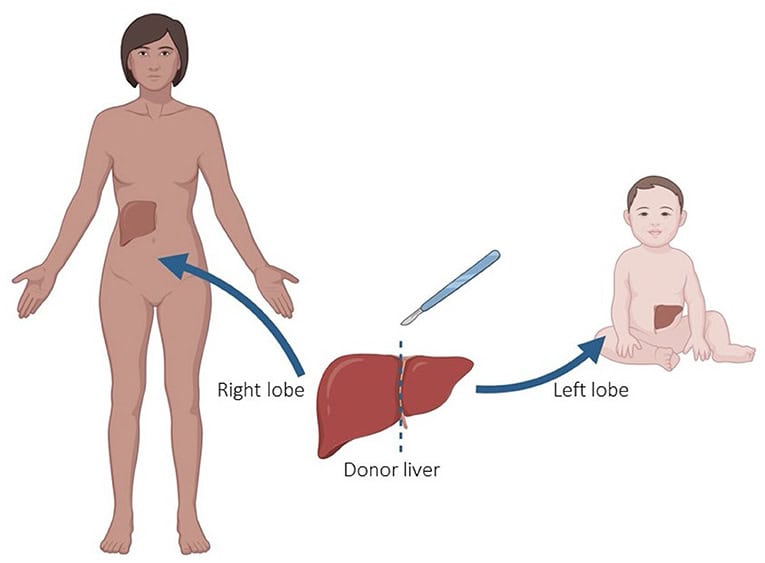 Leveren er unik i organtransplantationsverdenen, fordi én donorlever kan redde to liv. Når et lille barn har brug for en lever, har det ofte kun brug for en lille del af en voksen lever: den venstre lap. Den venstre lap er den lille venstre del af leveren, cirka en fjerdedel af hele organet. Den højre lap kan så gives til en voksen. Proceduren med kirurgisk adskillelse af leveren i to halvdele kaldes en leverdeling (figur 2).