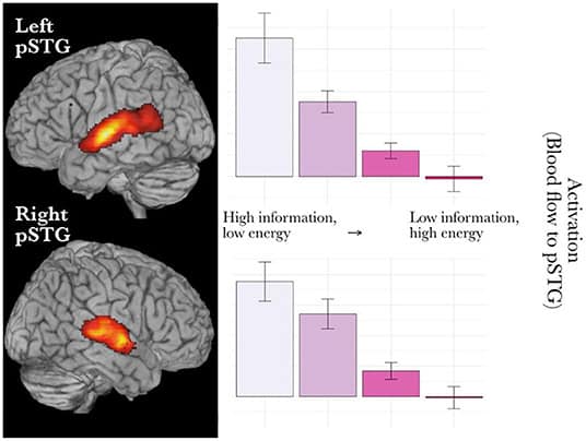 Baseret på resultater fra tidligere hjernescanningsstudier forventede vi en stærk respons i pSTG, når folk talte i støj med et mere energisk maskeringspotentiale. I stedet fandt vi noget, der overraskede os (figur 2). Selvom pSTG var aktivt, når folk talte i maskere med et højt energimæssigt maskeringspotentiale, var det kun en lille respons. Responsen var meget større, når folk forsøgte at tale i maskere med højt informationsindhold. Jo mere information, der var i baggrunden, jo mere aktiv var pSTG faktisk. Med andre ord arbejder vores hjerner hårdere for at koncentrere sig om at tale, når baggrundsstøjen indeholder information, som vi er interesserede i. Vores hjerner er mindre generet af, hvor meget baggrundsstøjen dækker vores stemmer.
