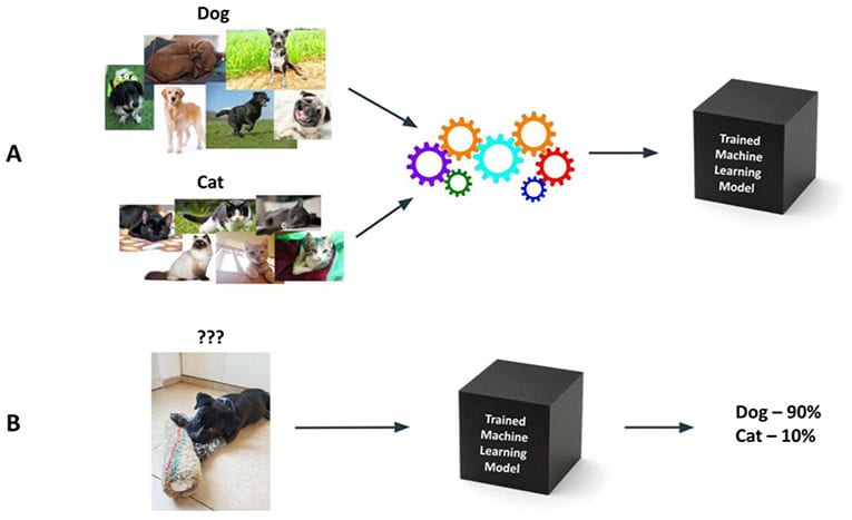 Maskinlæring betyder, at programmører giver computere eksempler, hver med en etiket, eller tag, der beskriver det. Efter mange eksempler lærer computeren at identificere eksemplerne på egen hånd (figur 1)! Børn lærer på en lignende måde – når et barn ser et dyr (eksemplet), fortæller en voksen barnet, hvilken slags dyr det er (tagget). Med nok eksempler vil barnet lære at identificere dyrene på egen hånd.
