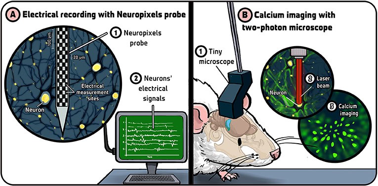 Denne nye tilgang blev muliggjort af to teknologier. Den første var udviklingen af nye elektroder, kaldet Neuropixels-sonder, der gør det muligt for os at “lytte til” neuroner ved at optage den elektriske aktivitet fra mange af dem samtidigt (figur 2A) [3, 4]. De nyeste Neuropixels-sonder indeholder mere end 5.000 optagelsessteder, der kan opfange elektriske signaler fra individuelle neuroner. Ved hjælp af Neuropixels-sonder kan forskere registrere den elektriske aktivitet i hele grupper, eller populationer, af neuroner – det er derfor, denne type optagelse kaldes en neural populationsoptagelse. I øjeblikket kan vi optage fra omkring 380 steder på en mikrochip på én gang, hvilket giver os adgang til aktiviteten i mere end tusind celler på samme tid. Jeg forventer, at vi i 2025 vil være i stand til at optage fra de fleste eller alle mulige steder på én gang, hvilket vil øge antallet af celler med endnu en