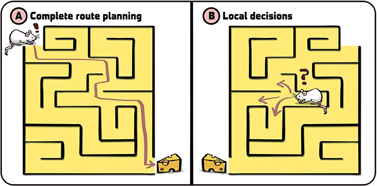 Et andet spørgsmål, som gittercelleforskere er interesserede i, er, om gitterceller er involveret i navigationsplanlægning. Med andre ord, kan gitterceller forudsige eller planlægge dyrets næste placering(er)? Og i så fald, hvor langt væk fra? Der er noget, der tyder på, at gittercellerne indeholder information om dyrets umiddelbare fremtidige placering. Men hvis et dyr navigerer i en labyrint, er det nødt til at lægge en plan for, hvordan det kommer fra startpunktet til enden af labyrinten (hvor det får en godbid). Lægger det den plan lige fra begyndelsen og husker en bane gennem labyrinten (figur 3A), eller navigerer det “i farten” og beslutter lokalt, hvor det skal dreje i hvert kryds (figur 3B)?