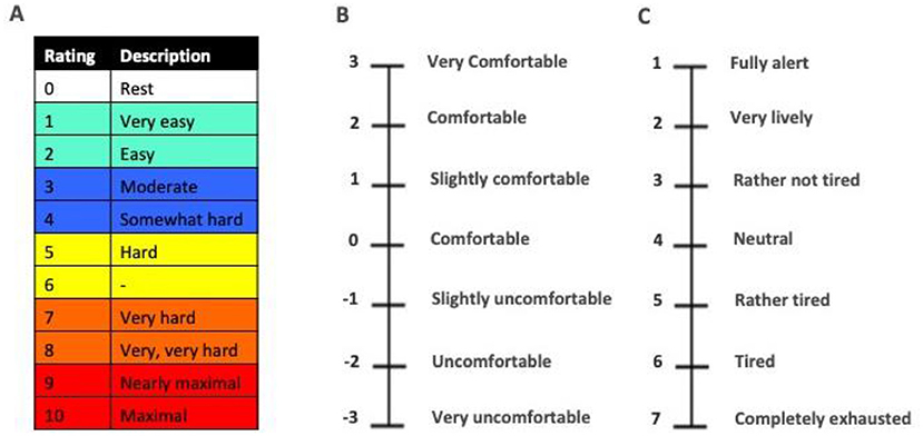 Udendørs-, krop- og T-shirt-temperaturer blev målt ved hjælp af termometre før spillet, hvert 15. minut under kampene og efter kampene. For at måle intensiteten af den fysiske aktivitet blev der anvendt en skala kaldet Borg Rating of Perceived Exertion (). (RPE) [4], hvor atleterne bliver spurgt, hvor hårdt de føler, at deres krop arbejder (figur 1A). Spillerne brugte andre skalaer til at beskrive deres termiske komfort (figur 1B) og følelse af træthed (figur 1C) i de samme tidsperioder. Ved afslutningen af kampene blev den mængde vand, hver atlet havde indtaget, også registreret.