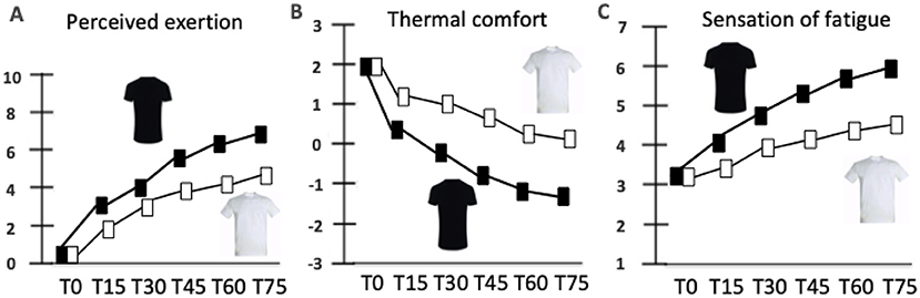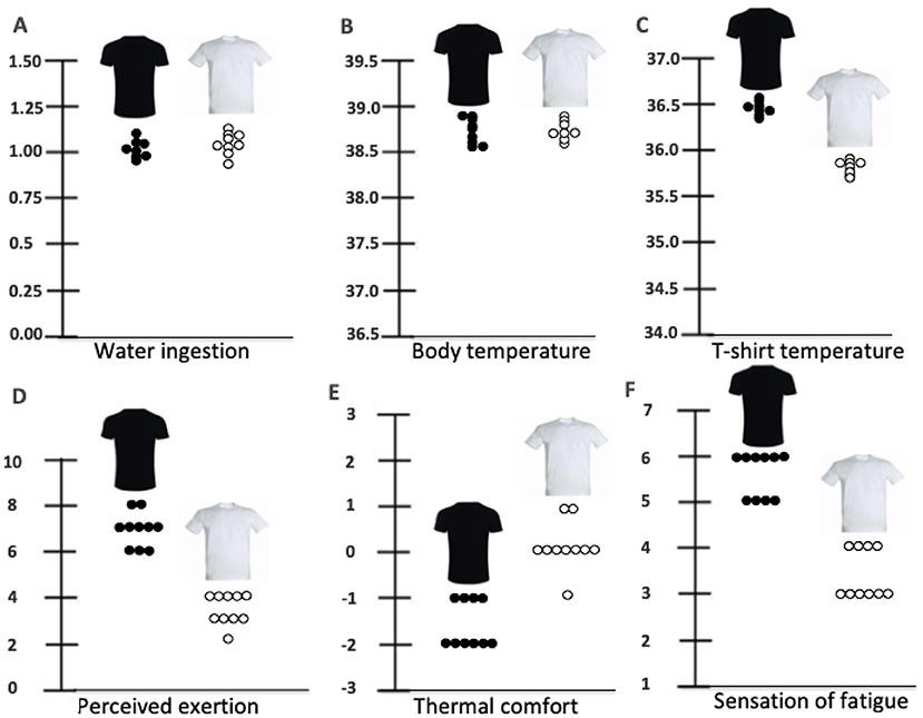 Uanset om atleterne bar en hvid eller sort T-shirt, var deres vandindtag (ca. 1,2 l) og kropstemperatur ens. T-shirtens temperatur var dog højere, når de bar en sort T-shirt frem for en hvid. Desuden var den oplevede anstrengelse, følelsen af træthed og termisk ubehag lavere, når atleterne bar en hvid T-shirt sammenlignet med en sort T-shirt (figur 2 og 3).