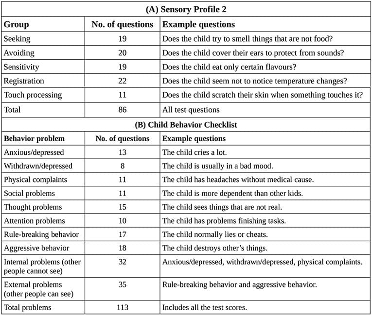 Spørgsmålene i SP-2-testen er inddelt i grupper: søgen, undgåelse, sensitivitet og registrering. Resultaterne i disse grupper definerer, hvordan barnet “ser” verden. For eksempel betyder høje scorer i spørgsmål fra den søgende gruppe, at barnet ønsker at føle alt fra omgivelserne, som at røre ved alt, se meget nøje på skarpe lys eller tage risici ved at klatre i et træ. Høje undgåelsesscorer betyder, at barnet ikke ønsker at mærke fornemmelser omkring sig og foretrækker at undgå dem. Høj sensitivitet betyder, at barnet føler fornemmelser stærkere end andre mennesker gør. Høje scorer i registreringskategorien betyder, at barnet næsten ikke mærker følelser, som andre let mærker. Ekstremt høje eller lave værdier på et af spørgsmålene indikerer sanseoplevelser, der er anderledes end hos ikke-autistiske børn. Figur 1A viser antallet af spørgsmål for hver gruppe med eksempler på spørgsmål. Vi tænkte, at fornemmelser af berøring (berøringsbearbejdning) også kunne være interessant for at forudsige ændringer i adfærd.
