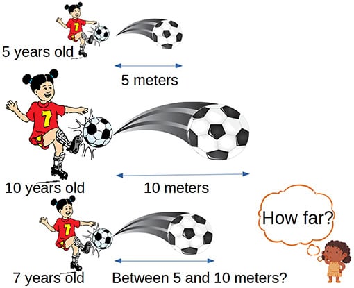 Lad os forestille os scenariet i figur 2. Der er en 5-årig pige, som sparker til en bold, og den går 5 m. En anden pige, som er 10 år gammel, sparker til bolden 10 m. Kan du prøve at gætte, hvor langt en 7-årig pige ville kunne sparke til bolden? Måske er det ikke let at vide med sikkerhed, men sund fornuft siger dig, at bolden sandsynligvis vil bevæge sig en afstand mellem 5 og 10 m, fordi den 7-årige pige forventes at være stærkere end den 5-årige pige, men svagere end den 10-årige pige.