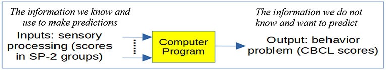 I dette eksempel bruges pigens alder til at forudsige den afstand, bolden tilbagelægger. I vores autismestudie bruger maskinlæringsprogrammet resultaterne fra SP-2-testen til at forudsige fremtidige ændringer i adfærd, som vil blive afspejlet i en fremtidig CBCL-test. I figur 3 brugte vi for eksempel oplysninger om, hvordan et barn undgår sanseoplevelser (undgår i figur 1A) til at forudsige eksistensen af problemer i sociale miljøer (sociale problemer i figur 1B), som vi vil se i det næste afsnit.