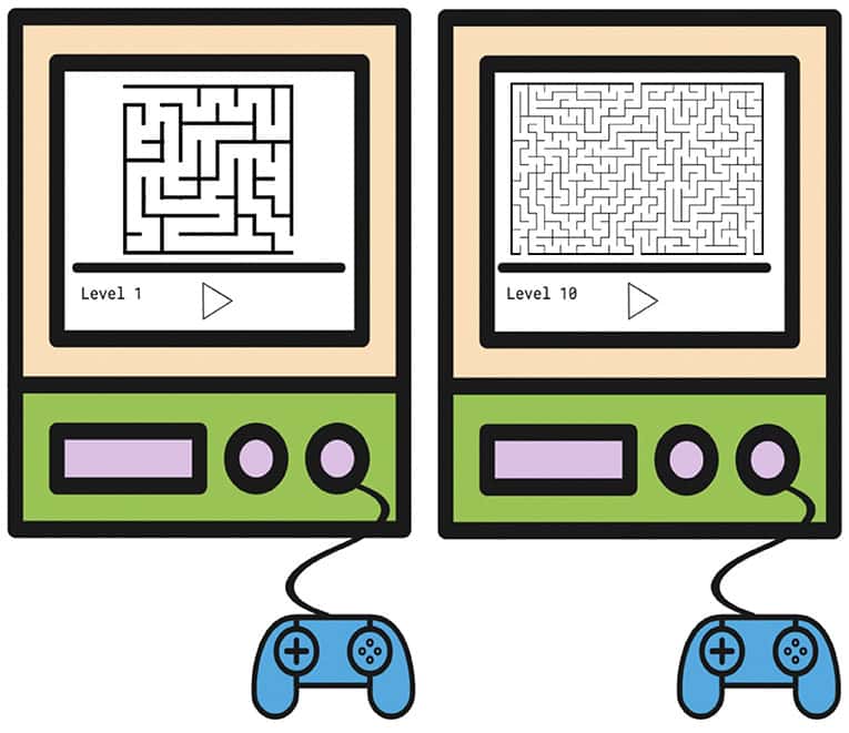 Seriøse spil er enhver form for spil (f.eks. videospil, brætspil), der er designet med et primært mål ud over bare at være sjovt at spille. Det inkluderer spil, der fungerer som behandling! Hvad er det bedste seriøse videospil til at hjælpe med ADHD? Der findes ikke ét seriøst spil, som er det bedste. Der er snarere en masse spil, der har de rigtige funktioner til at hjælpe med ADHD. For at et seriøst spil skal være nyttigt for ADHD, skal det opfylde tre krav [3]. For det første skal spillet være let at forstå. For det andet må spillet ikke være for svært at huske. Sidst, men ikke mindst, skal hvert niveau blive en smule sværere (som vist i figur 2). Disse tre funktioner holder spillerne fokuserede og engagerede i længere og længere tid. Det er vigtigt, at disse spil er udfordrende, men ikke umulige – på den måde bliver spillerne ikke frustrerede og holder op med at spille. Hvis et videospil har disse egenskaber, kan det hjælpe med at træne hjernen til at have en længere opmærksomhedsspændvidde!