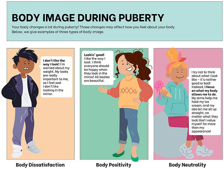 Med alle de måder, kroppen ændrer sig på, kan unge have svært ved at acceptere deres nye udseende. Når nogen ikke kan lide noget ved deres krop eller udseende, kaldes det et negativt kropsbillede, eller body dissatisfaction. Hos piger viser utilfredshed med kroppen sig ofte som utilfredshed med ændringer i mave og talje. Mange piger bekymrer sig om den vægt, de tager på i puberteten, selv om det er en normal del af det at blive ældre [3]. Drenge kan også føle utilfredshed med deres krop. For eksempel ønsker nogle drenge, at de kunne få flere muskler og kan ikke lide at føle sig “magre”. Drenge og piger kan begynde at få mere opmærksomhed fra jævnaldrende og kan føle sig selvbevidste om deres kroppe. Unge mennesker, der bliver drillet med deres vægt, er særligt tilbøjelige til at føle utilfredshed med deres krop [4]. Selvom utilfredshed med kroppen er en normal følelse, kan det få unge til at spise usundt og træne forkert i et forsøg på at ændre deres udseende.