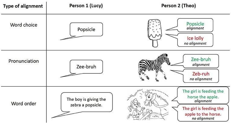 Målet med en samtale er, at du og din samtalepartner at dele sine tanker og ideer med hinanden. For at få en vellykket samtale skal du forstå din samtalepartners sprog og producere et sprog, som din samtalepartner kan forstå. Det er ikke let! Du skal sørge for at tale og lytte på de rigtige tidspunkter. Du skal tænke på alle de ord, lyde og sætninger, du vil sige, mens du lytter til, hvad din partner siger. Du skal også vælge ord, lyde og sætninger, som du tror, din partner kan forstå. En ting, folk gør for at gøre det lettere, er at kopiere det sprog, som deres samtalepartner allerede har brugt i samtalen. Det kaldes alignment og det er en adfærd, der almindeligvis bruges af mennesker til at gøre samtaler lettere og mere vellykkede [1].