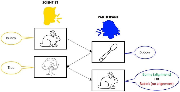 I et ordvalgseksperiment beskriver deltageren og forskeren for eksempel billeder af forskellige genstande. Nogle af disse billeder vil have to mulige navne, såsom “kanin” og “kanin”. Efter tur beskriver forskeren sit billede ved hjælp af ordet “kanin”. Et par billeder senere får deltageren vist det samme billede. Hvis deltageren også beskriver billedet med ordet “bunny” (i stedet for “rabbit”), viser det, at deltageren tilpasser sit ordvalg til forskerens (figur 2).