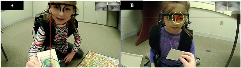 Da børnene først ankom til vores laboratorium, fik de vores mobile eye-trackere på. Derefter gik de ind i et særligt rum fyldt med legetøj. Vi fortalte dem, at de skulle lege, som de havde lyst til. Vores særlige rum havde et tovejsspejl, så vi kunne se børnene lege, men de kunne ikke se os. Vi optog også legesessionen på video. Børnene legede sammen i 5 minutter. Forældre eller omsorgspersoner udfyldte spørgeskemaer, hvor de fortalte os, om deres børn udviste en masse adfærdshæmning eller generthed.