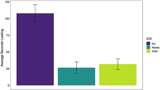 Vores første spørgsmål var: Kigger børn mere på legetøj end på venner, når de leger? Vi stillede dette spørgsmål for at se, om vi ville få det samme svar som i andre undersøgelser. Forskere kan godt lide at gøre dette, fordi det viser, at der er et mønster og ikke bare et enkeltstående resultat. På grund af resultaterne fra andre undersøgelser forventede vi, at børn mest ville kigge på legetøj. Tror du, vi fandt, hvad vi forventede? Det gjorde vi! Børn brugte mere tid på at kigge på legetøj end på venner eller andre steder (figur 3). Det betyder, at vores undersøgelse viste et mønster med andre undersøgelser. Det er vigtigt at vide, især fordi ældre undersøgelser har talt, hvor længe børn kigger på ansigter på computere [7]. Vores mobile eyetracking-undersøgelse fortalte os om, hvordan børn kigger på venner i den virkelige verden.