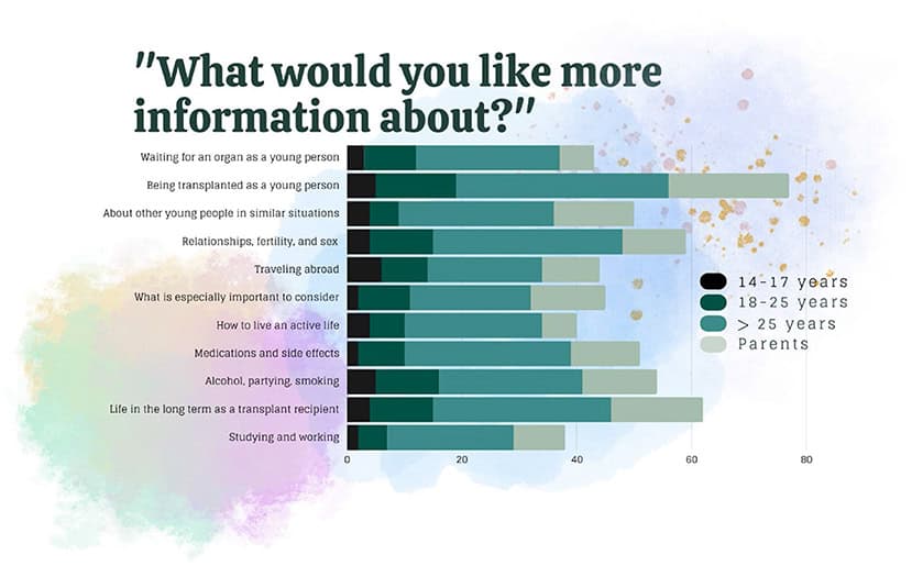 I denne svenske undersøgelse henvendte vi os til fire målgrupper: teenagere på enten 14-17 år eller 18-25 år, som enten var transplanterede eller stod på venteliste til transplantation, unge voksne over 25 år, som var transplanterede, da de var yngre, og forældre med transplanterede børn under 25 år. I alt 44 unge i alderen 14-25 år deltog i projektet, som omfattede spørgeskemaer, interviews og workshops. Halvtreds procent af deltagerne var kvinder, 41 % var mænd, og 9 % valgte ikke at oplyse deres køn. Undersøgelsen blev organiseret af den svenske organisation More Organ Donation (MOD).