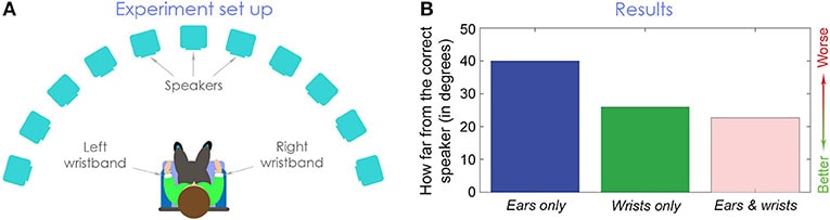 Vores frivillige havde alle problemer med at høre og brugte cochlear-implantater, som er en type kirurgisk indopereret høreapparat. De sad i en stol med højttalere i en halvcirkel omkring sig og med vibrerende armbånd på hvert håndled (figur 2A). Vi testede, hvor godt de frivillige kunne finde ud af, hvor lydene kom fra, når de enten kun brugte deres ører, kun armbåndene eller deres ører sammen med armbåndene [1. ]Vi afspillede en lyd fra en højttaler og spurgte derefter den frivillige, hvilken højttaler lyden kom fra. Vi beregnede, hvor godt de lokaliserede lyden ved at måle, hvor langt deres svar var fra den rigtige højttaler. Vi målte denne afstand i grader, som vinklen mellem den rigtige højttaler og den, de valgte. Vi gentog denne proces igen og igen og beregnede et gennemsnit af alle pointene. Vi var meget tilfredse med det, vi fandt!