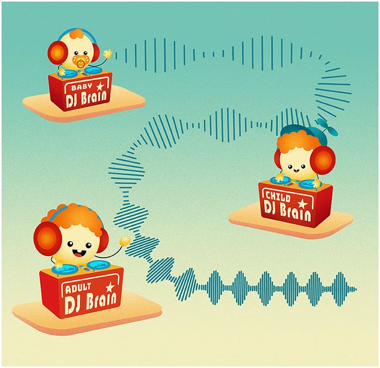 Har du nogensinde talt med en baby? Du har måske bemærket, at du taler lidt anderledes – din stemme bliver højere, og du taler langsommere. Selvom dette kan virke lidt fjollet, passer det nøjagtigt til rytmerne i babyhjernen. Babyer behandler sprog bedre, når folk taler til dem på denne specielle måde [4]. For at vende tilbage til vores eksempel er det, som om danserne skal tilpasse deres dansetempo, så det passer til de langsommere toner fra DJ’en i babyhjernen. Hvis de bevæger sig med det rigtige tempo, vil deres dansetrin passe til de langsomme beats i den sang, DJ’en spiller – ligesom vi taler langsommere til babyen.