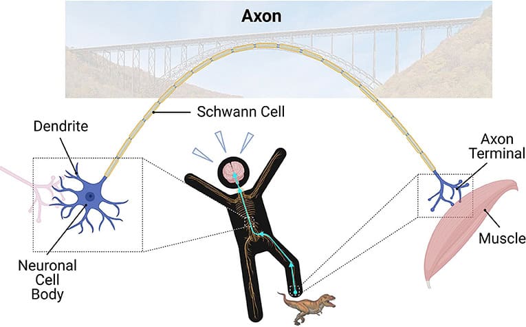 Neuroner har fire hoveddele: dendritter, cellelegeme, akson og aksonterminalen (figur 1). Dendritter er de små grene af neuronen, der modtager indgående beskeder fra andre neuroner, som de er forbundet med. Signalerne bevæger sig derefter gennem neuronets cellelegeme, som er kontrolcentret for cellens aktiviteter. Til sidst når signalerne frem til den største del af neuronet: aksonet. Axoner strækker sig langt ud fra cellelegemet og videresender beskederne til andre neuroner eller mål. Det sker for enden af aksonet, som kaldes aksonterminalen. Ligesom broer gør det muligt for biler at køre og nå land på den anden side, er aksoner vigtige “broer” i nervesystemet (figur 1). De gør det muligt for elektriske og kemiske signaler at bevæge sig op til 1 m (3 fod) væk! Ingen anden celletype i din krop kan gøre det!