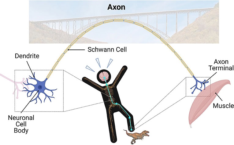 Neuroner har fire hoveddele: dendritter, cellelegeme, akson og aksonterminalen (figur 1). Dendritter er de små grene af neuronet, som modtager indkommende beskeder fra andre neuroner, de er forbundet med. Signalerne bevæger sig derefter gennem neuronets cellekrop, som er kontrolcentret for cellens aktiviteter. Til sidst når signalerne den største del af neuronet: aksonet. Aksoner strækker sig langt ud fra cellekroppen og videresender beskederne til andre neuroner eller mål. Dette sker for enden af axonet, kaldet axonterminalen. Ligesom broer gør det muligt for biler at køre for at nå land på den anden side, er aksoner vigtige “broer” i nervesystemet (figur 1). De tillader elektriske og kemiske signaler at bevæge sig op til 1 m væk! Ingen anden celletype i din krop kan gøre det!