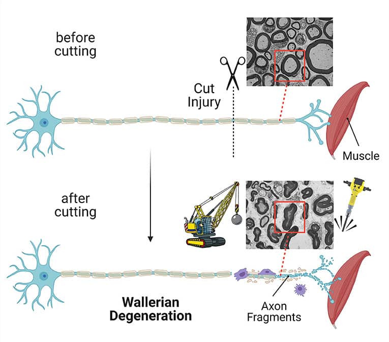 Lad os tænke på axonet som en lang bro igen. Hvis der sker en alvorlig skade på et axon, bliver “broen” svag, og den elektriske og kemiske “trafik” kan ikke længere køre sikkert over den. Et hærgende nedrivningshold slippes løs for at rive broen ned, fordi det efter kroppens mening er bedre at rive en svært beskadiget bro ned end at forsøge at vedligeholde en ødelagt.