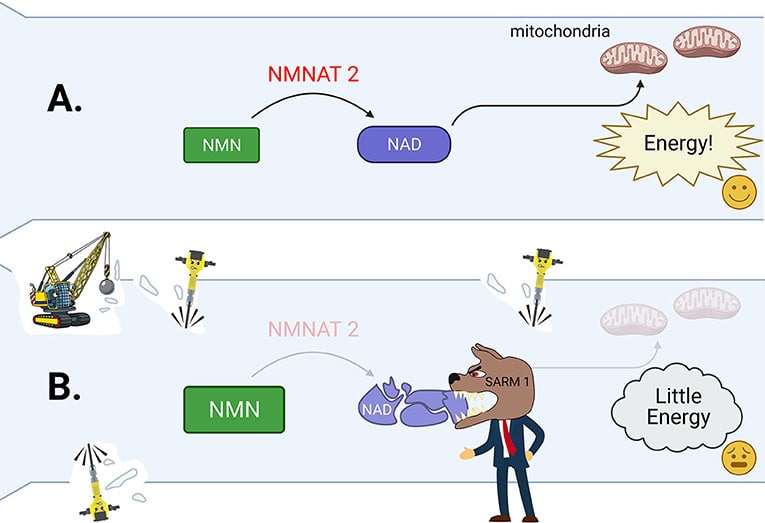 Selvom du måske foretrækker at spise slik, minder dine forældre dig om at spise frugt og grønt, fordi disse fødevarer indeholder vigtige næringsstoffer, der giver os energi og hjælper os med at holde os stærke. For at axoner kan forblive stærke og sunde, har de brug for et særligt næringsstofmolekyle kaldet. NAD spiller en vigtig rolle i axonets evne til at producere den energi, det skal bruge for at overleve. Energien genereres gennem vejene glycolyse og mitokondriel respiration, som kræver NAD for at fungere. NAD fremstilles af molekylet NMN af enzymet NMNAT2. NMNAT2 er fordelt i hele det sunde akson ved hjælp af et leveringssystem kaldet aksonal transport [4] (Figur 3A). Når niveauerne af NMNAT2 falder, fordi et akson er skadet eller sygt, kæmper aksonet på grund af det resulterende fald i NAD og energi (figur 3B).