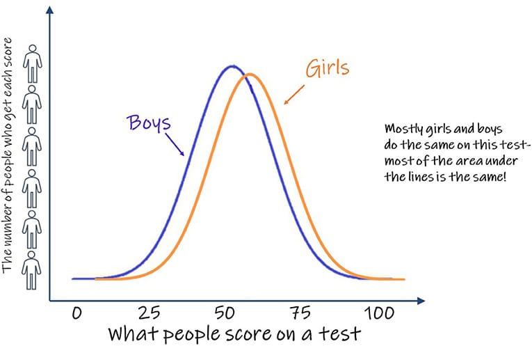 Den anden vigtige ting er, at undersøgelser af gruppeforskelle ser på netop det: grupper. Hvis du tager en gruppe drenge, vil nogle af dem være gode til matematik, de fleste vil være ok til matematik, og nogle vil være dårlige til matematik. Det samme gælder for piger. Selv om drengene som gruppe klarer sig lidt bedre i en bestemt test, fortæller det dig ikke noget som helst om et specifikt individ (som du kan se i figur 1). De to grupper vil overlappe hinanden betydeligt. En enkelt dreng vil sandsynligvis klare sig bedre end mange piger, og en enkelt pige vil sandsynligvis klare sig bedre end mange drenge. Så selv om der kan være nogle forskelle mellem den måde, piger og drenge tænker på, er disse forskelle små, og gruppeforskelle fortæller dig alligevel ikke noget om noget individ.