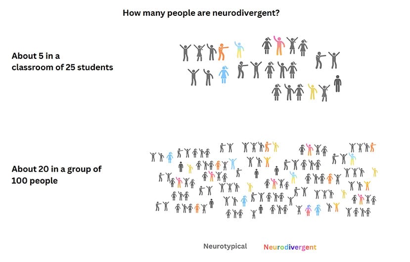 De fleste mennesker er neurotypiske. Fordi neurotypiske mennesker synes at udgøre den største gruppe af mennesker i verden, betragtes den måde, de behandler information på, ofte som “normal”. Omkring en ud af fem mennesker er neurodivergent. Deres hjerner behandler information anderledes end neurotypiske menneskers. Der er masser af forskellige typer neurodivergens: Hjernen behandler så mange typer information, så der er mange måder, hvorpå folk kan behandle den forskelligt! Figur 1 illustrerer en neurodiverse gruppe af neurotypiske og neurodivergente mennesker.