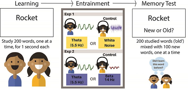 I det første eksperiment blev 50 personer (26 kvinder, 24 mænd, i alderen 18-25 år) testet. De blev delt ligeligt op i to grupper. Forsøgsgruppen modtog lys og lyde, der boostede theta-bølger (5 Hz). Kontrolgruppen fik et tilfældigt mønster af flimrende lys og lyde (hvid støj), og denne gruppe blev brugt som sammenligning. Ingen af deltagerne vidste, hvilken gruppe de var placeret i. I det andet eksperiment blev 40 nye personer testet (22 kvinder, 18 mænd, i alderen 18-26 år). Igen blev de delt op i to grupper, som modtog forskellige entrainment-mønstre. Denne gang fik den ene gruppe theta-lyd (5 Hz), og den anden gruppe fik beta-lyd (14 Hz). Dette blev gjort for at se, om træning af andre hjernemønstre også ville forbedre hukommelsen, eller om hukommelsesforbedringen var specifik for theta.